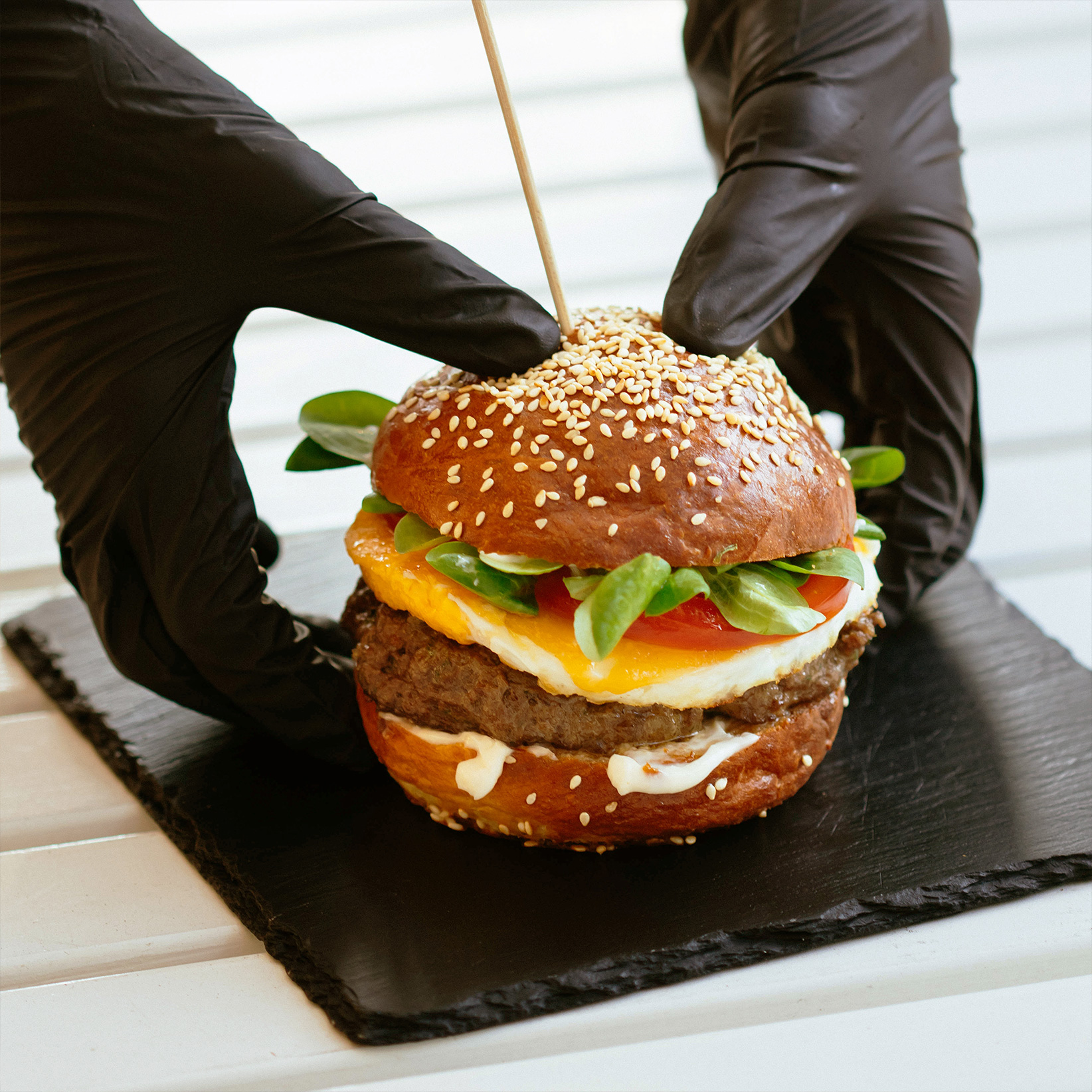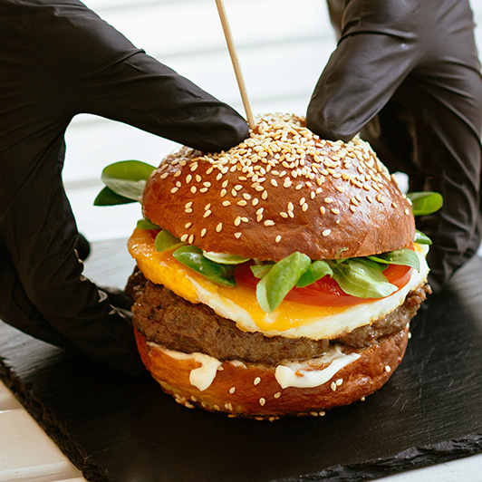 Three Fried Eggs, house hot sauce, local cheddar mac, lettuce, pickle & onion on a sesame roll